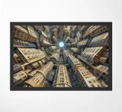 Una surreale visione fisheye di strutture urbane torreggianti con dettagli intricati e modelli simmetrici, che convergono verso un cielo radioso. Il design architettonico stratificato evidenzia l'innovazione moderna e la creatività artistica.