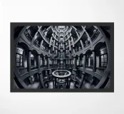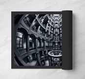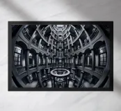 Un drammatico interno circolare in bianco e nero con colonne imponenti, finestre ad arco e intricati motivi geometrici visti da una prospettiva fisheye, che evidenzia la simmetria e la grandezza architettonica.