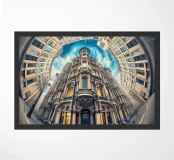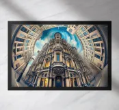Un ipnotico edificio in stile vittoriano è circondato da un paesaggio urbano circolare. Le finestre illuminate contrastano con il vorticoso cielo notturno stellato, creando un'atmosfera incantevole e surreale. Gli intricati dettagli architettonici aggiungono eleganza e mistero.
