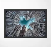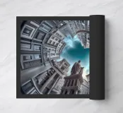 Questa immagine raffigura un'impressionante disposizione architettonica circolare con alti edifici classici modernizzati che convergono verso il cielo. Una statua prominente al centro esalta la prospettiva drammatica sotto un cielo azzurro e nuvoloso.