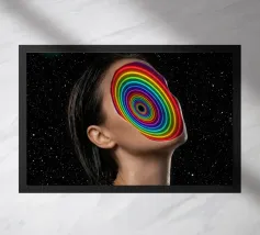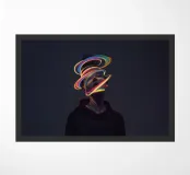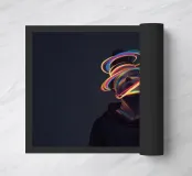 Un'opera d'arte digitale surreale presenta una donna con una felpa scura con cappuccio, il cui volto è illuminato da vibranti scie di luce al neon. I vortici multicolori e incandescenti le avvolgono la testa e il collo, creando un'atmosfera futuristica e onirica.
