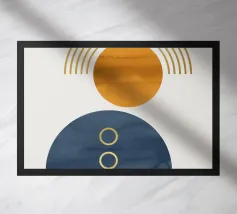Una composizione geometrica presenta varie forme, tra cui un semicerchio che ricorda il sole, cerchi concentrici e archi in tenui tonalità pastello. Il disegno è simmetrico e bilancia gli elementi visivamente attraenti.
