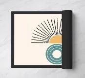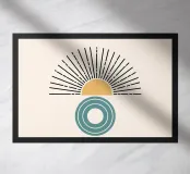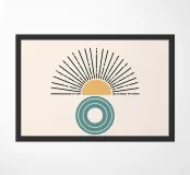 Una composizione geometrica presenta varie forme, tra cui un semicerchio che ricorda il sole, cerchi concentrici e archi in tenui tonalità pastello. Il disegno è simmetrico e bilancia gli elementi visivamente attraenti.
