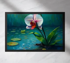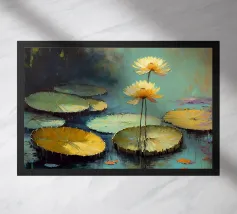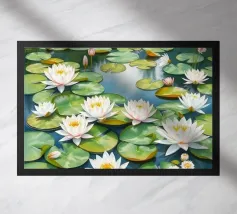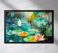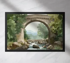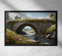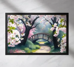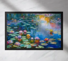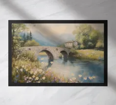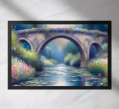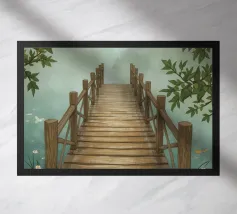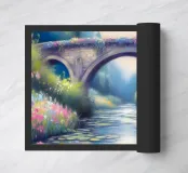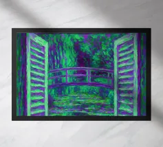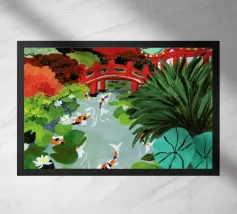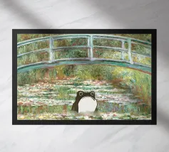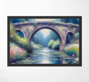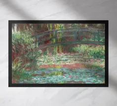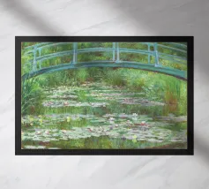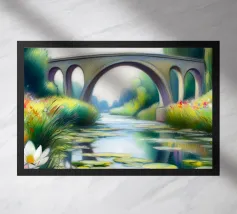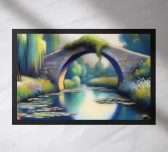 Disegno a pastello di un ponte con laghetto di ninfee sottostante.