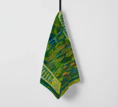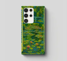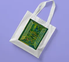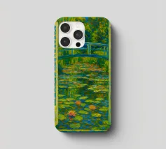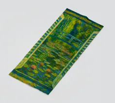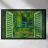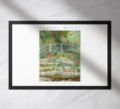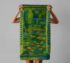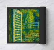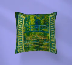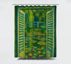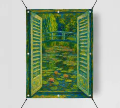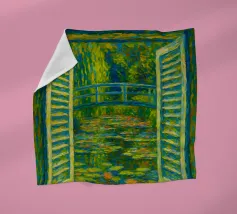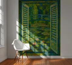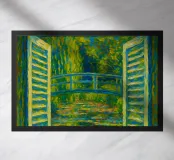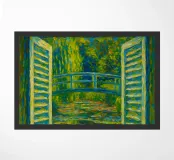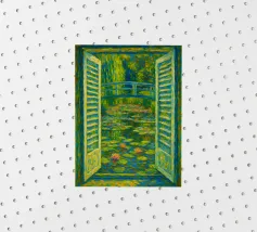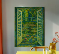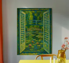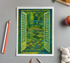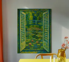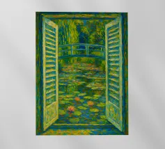 Dipinto colorato di una finestra aperta su uno stagno di ninfee con ponte.