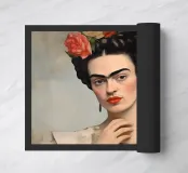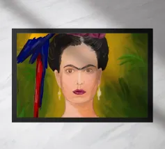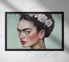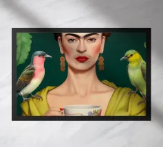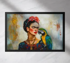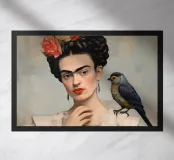 Il murale di moda mostra Frida Kahlo in stile boho con un uccello sulla spalla, circondata da motivi floreali e colori tenui della terra.