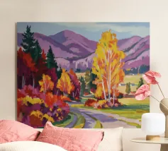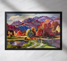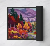 Un dinamico paesaggio autunnale che ritrae una strada che si snoda attraverso una fitta foresta con alberi dalle spettacolari tonalità di rosso fuoco, arancione vibrante e giallo brillante, con le montagne lontane visibili.
