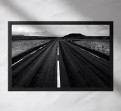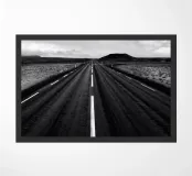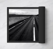 Fotografia in bianco e nero di una strada molto dritta in Islanda. Regalo decorativo per chi ama questo paese del Nord Europa e cerca qualcosa di elegante per la propria parete.