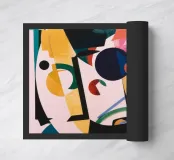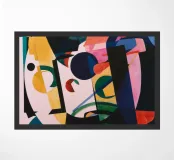 Questa opera d'arte presenta una composizione astratta con un mix di forme geometriche e colori vivaci come il rosa, il giallo, il verde e il nero. Le forme sono stratificate e creano un senso di complessità.