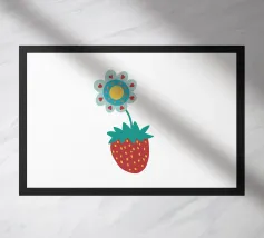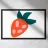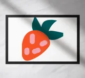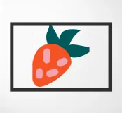 La rappresentazione stilizzata e semplicistica di una fragola presenta un corpo arancione con tre semi rosa e foglie verde scuro. Il design minimalista utilizza colori e forme audaci per evocare un'atmosfera giocosa e moderna.