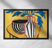 Una suggestiva natura morta con fogliame blu in un audace vaso a righe bianche e nere, accompagnato da una tazza più piccola a righe. La composizione è collocata su un vivace sfondo giallo, creando un effetto visivo di grande impatto.
