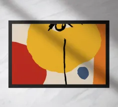 Un ritratto minimalista e astratto di un volto, con un grande cerchio giallo che rappresenta sia la testa che il sole, reso in uno stile semplice e grafico.