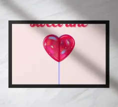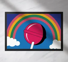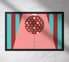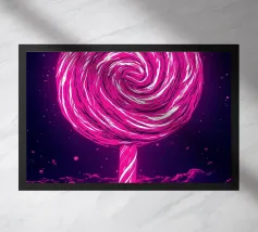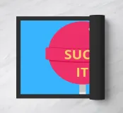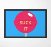 Un lecca-lecca rosa con la scritta "SUCK IT" in lettere gialle. La superficie lucida della caramella aggiunge un tocco giocoso al disegno.