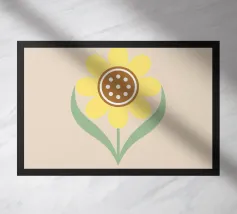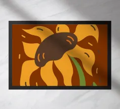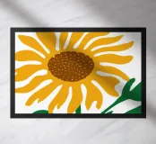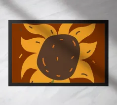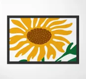 È raffigurato un girasole stilizzato con petali di colore giallo intenso e centro marrone. Foglie e steli verdi aggiungono contrasto ed equilibrio alla composizione.