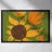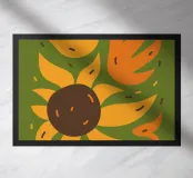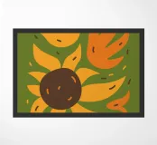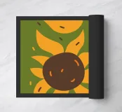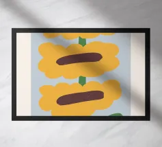 Forme astratte di colore giallo e arancione brillante che ricordano un girasole. Forme curve e piccole linee aggiungono un senso dinamico di movimento alla composizione.
