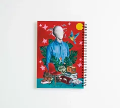 Questo dipinto mostra una figura seduta a una scrivania circondata da libri e piante. Lo sfondo è rosso con stelle bianche, creando un'atmosfera surreale e onirica.