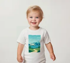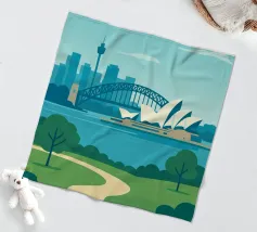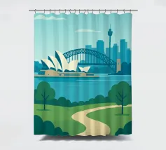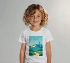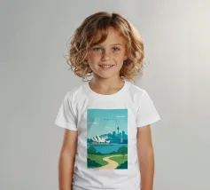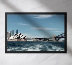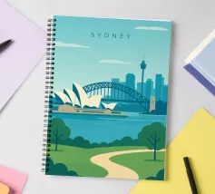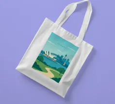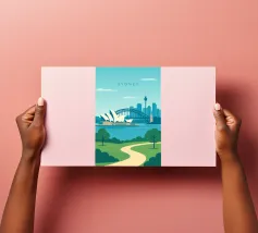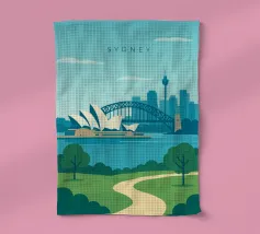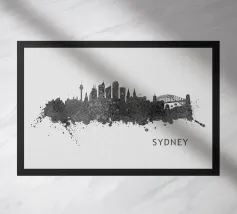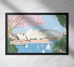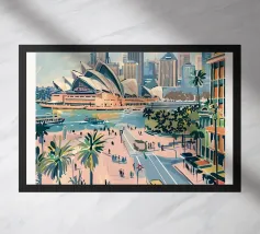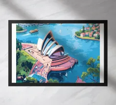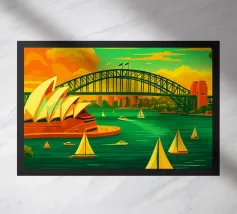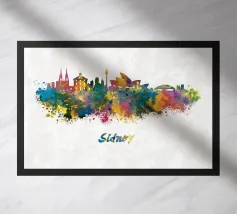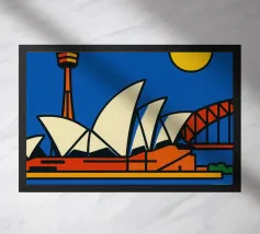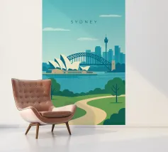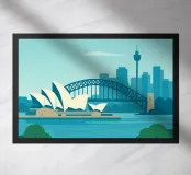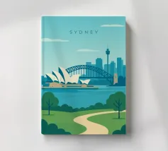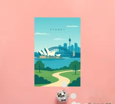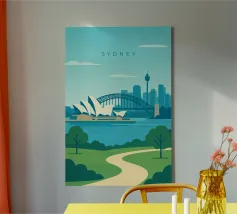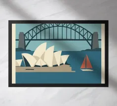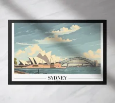 Design di viaggio minimalista con i punti di riferimento della città australiana di Sydney. Collage decorativo di edifici famosi come la Sydney Opera House, il Sydney Harbour Bridge e la Sydney Tower Eye.