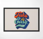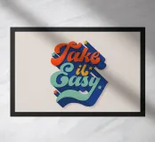 Un vivace disegno tipografico in stile retrò con la frase "Take It Easy" in grassetto, con caratteri ispirati agli anni '70. Il caldo mix di rosso, blu e verde menta con accenti di stelle aggiunge un'atmosfera giocosa e nostalgica, perfetta per un'estetica rilassata ed elegante. Un pezzo elegante e nostalgico che irradia calma e gioia. Creato da showmemars