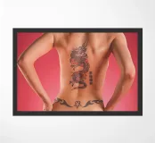 Una modella di lingerie con la schiena tatuata