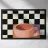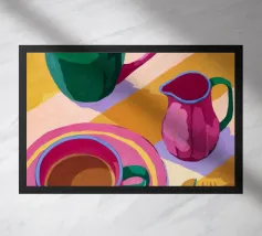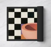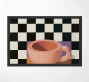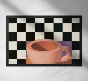 Una semplice natura morta di una tazza di caffè rosa su una superficie a scacchiera in bianco e nero, su uno sfondo neutro, che mette in risalto forma e modello.
