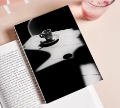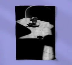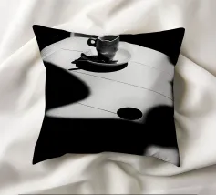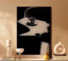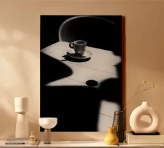 tazza da caffè tavolo piattino ombre gioco di luci ceramica manico tazza superficie bordo nero e bianco contrasto gioco di ombre bevanda monocromatico illuminazione cerchi angolo natura morta composizione