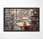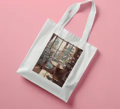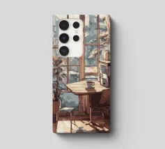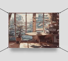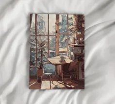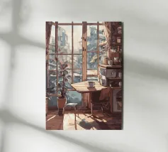 tazza da caffè finestra luce solare pianta in vaso sedia tavolo tende libreria edifici paesaggio urbano pavimento in legno bancone della cucina scaffali vista urbana angolo accogliente oggetti decorativi luce del mattino mobili in legno architettura design d'interni