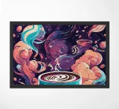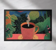 tazza da caffè cosmo turbine nuvole cielo notturno pianeti stelle galassia piattino vapore luna colori vibranti fantasia oggetti galleggianti celeste spazio stravagante surreale vortici spazio esterno