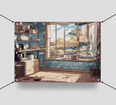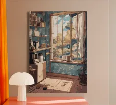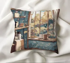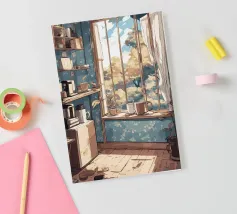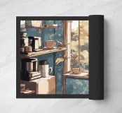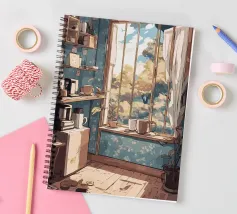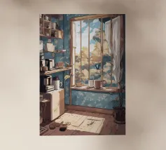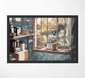 tazze da caffè finestra luce solare scaffali piante libri sedia pavimento in legno finestra aperta tende set da tè pianta in vaso quaderni stanza illuminata dal sole arte da parete atmosfera accogliente tazza di tè mobili in legno pavimento laminato sole