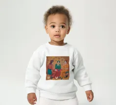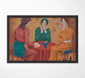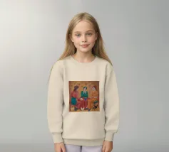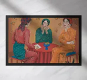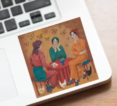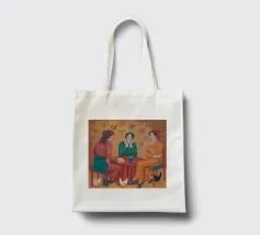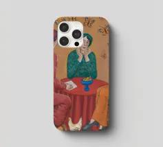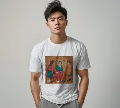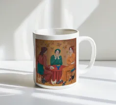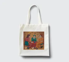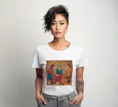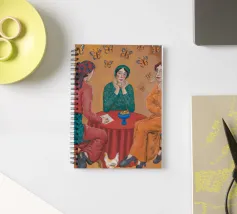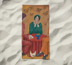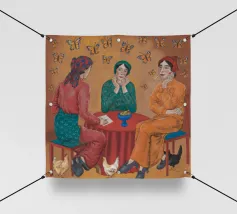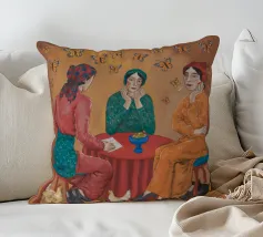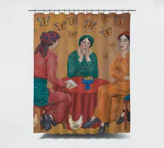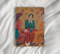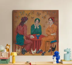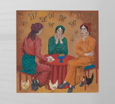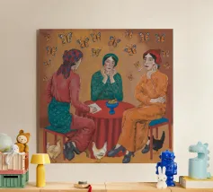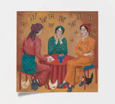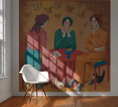 Quattro persone sono sedute a un tavolo, circondate da farfalle. I loro abiti colorati e lo sfondo dettagliato creano una scena intima e stravagante dell'ora del tè.
