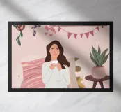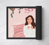 Una donna siede su un accogliente letto rosa con una tazza di tè, circondata da piante sospese, creando un momento di calma per la cura di sé.