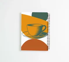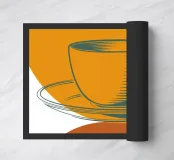 Un'audace rappresentazione stilizzata di una tazza da tè si trova in cima a un piattino, circondata da forme geometriche sovrapposte nei toni della terra. Il disegno utilizza una tavolozza di colori limitata di arancione, verde e marrone per creare una composizione moderna e astratta.