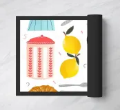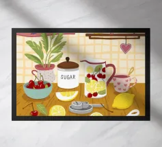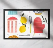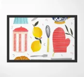 teapot teacup lemon oven mitt scale jar honey lid spoon fork whisk bird croissant olive branch illustration pattern ceramic pair of birds utensils kitchenware
