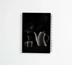 teiera tazza da caffè vapore sfondo nero oggetti in ceramica bevanda calda beccuccio per teiera manico bordo della tazza scena minimalista contrasto scia di fumo silhouette illuminazione drammatica composizione semplice design elegante oggetto per la casa stoviglie natura morta routine mattutina