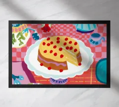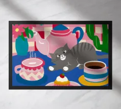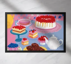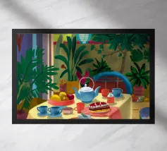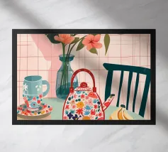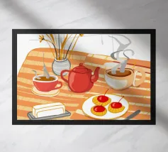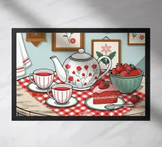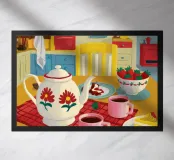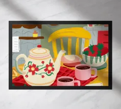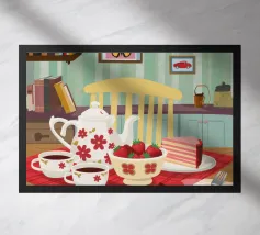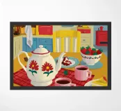 Un accogliente tavolo da cucina, apparecchiato con teiere di ciliegio e dolciumi, risplende nei caldi colori giallo e rosso.