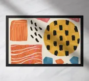 Un moderno collage astratto con una varietà di motivi e texture, tra cui punti, onde e terrazzo, in una calda tavolozza di terracotta, arancione e blu.