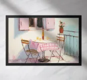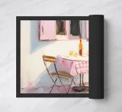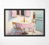 Il motivo raffigura un'affascinante scena di balcone mediterraneo in tenui colori pastello. Un tavolino con una tovaglia rosa, due sedie e una bottiglia invitano a soffermarsi al sole. Le pennellate morbide e la luce calda trasmettono una sensazione di estate, leggerezza e vacanze al mare.