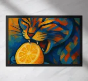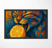 Audace, colorato e deliziosamente stravagante, questo gatto astratto non può fare a meno di affondare i denti in un limone giallo brillante. Le vibranti tonalità di blu e arancione creano un contrasto sorprendente, infondendo all'opera d'arte umorismo ed energia. Un'opera giocosa che aggiunge un tocco di colore e carattere a qualsiasi spazio.