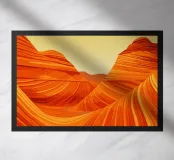 Disegno di viaggio minimalista e decorativo con "The Wave", la colorata formazione rocciosa sulle pendici del Coyote Buttes in Arizona, USA. Un disegno per le vacanze estive per tutti coloro che amano andare in vacanza nei parchi nazionali degli Stati Uniti e trovano bella questa natura e il paesaggio rossastro.