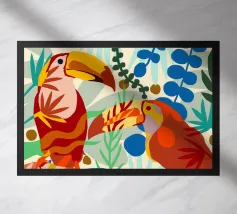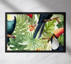 Tre scimmie e un tucano in un giardino con fiori per bambini e per la casa