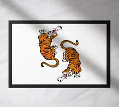 Una tigre stilizzata è raffigurata in una posa dinamica e giocosa. Le strisce arancioni e nere della tigre spiccano con forza, creando un contrasto visivo di grande effetto.