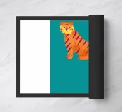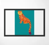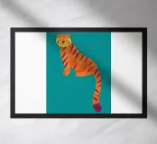 Una vibrante tigre a strisce arancioni e rosso scuro si staglia su uno sfondo verde acqua, catturando l'attenzione con il suo aspetto stilizzato. La lunga coda ricurva aggiunge un elemento dinamico alla composizione.