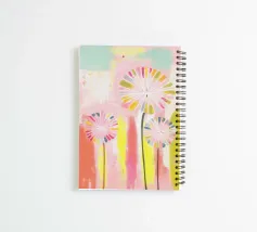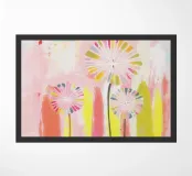 Un'opera d'arte astratta minimalista con tre denti di leone in tenui tonalità pastello di rosa e arancione, ispirata allo stile urbano degli anni '70. I denti di leone sono resi con linee pulite e fluide e un tocco geometrico moderno, con le teste dei semi sferiche delicatamente strutturate ma semplificate. Uno sfondo tenue completa la composizione, mescolando dolci sfumature di blush e pesca. Il design complessivo emana un'atmosfera nostalgica ma contemporanea, in equilibrio tra il fascino retrò e la raffinatezza moderna. Perfetto per gli interni urbani che cercano un tocco di calore e di eleganza minimalista.