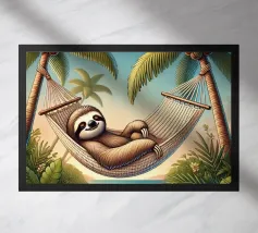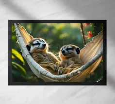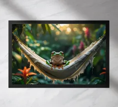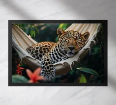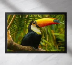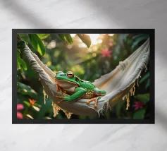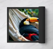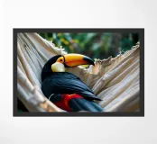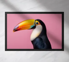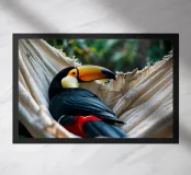 Con il suo iconico becco e la sua posa rilassata, questo tucano sembra nato per la vita sull'amaca. Porta colore e calma, sia che lo appendiate in giardino che in un angolo soleggiato. Una stampa estiva che ricorda che anche il dolce far niente è un talento. Questa stampa fa parte della serie "Jungle Hammock Tales" - relax estivo con una strizzatina d'occhio. Questa illustrazione digitale è stata creata in stile fotorealistico, con un occhio di riguardo per la luce, i dettagli e l'atmosfera. Visualizzata da Trinkets NL Design Studio utilizzando l'AI.
