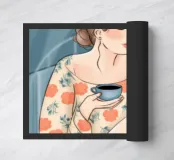 The painting features a person sitting comfortably, holding a cup of tea. The floral-patterned attire and the calm expression convey a sense of tranquility and relaxation.
