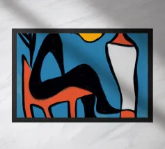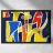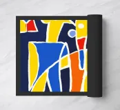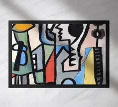 Linee decise e colori vivaci formano rappresentazioni astratte di figure su uno sfondo blu scuro. Forme che ricordano volti e corpi umani si mescolano a forme geometriche, suggerendo una composizione vivace e stravagante.