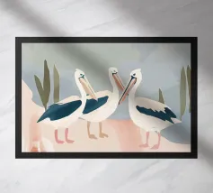 Una scena tranquilla di tre passeri su rami con foglie semplici.