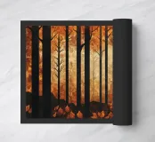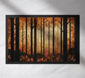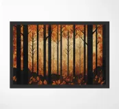 Il dipinto digitale di una foresta autunnale presenta sagome scure di alberi su uno sfondo caldo e dorato. L'opera d'arte testurizzata mostra un fogliame dettagliato nei toni dell'arancione e del marrone, creando una scena di bosco serena e suggestiva.