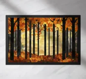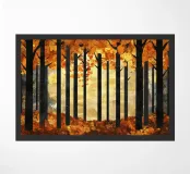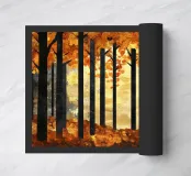 Una splendida rappresentazione astratta di una foresta autunnale con alti tronchi scuri e fogliame dorato. Lo sfondo caldo e luminoso esalta la composizione geometrica, creando un'atmosfera serena e moderna.