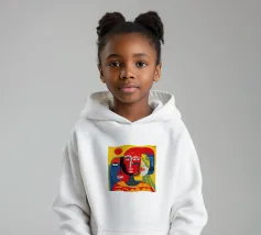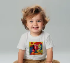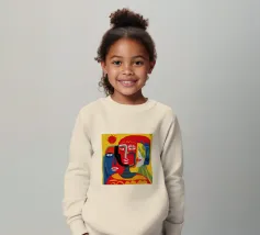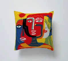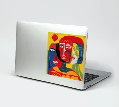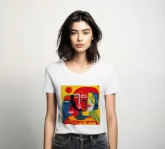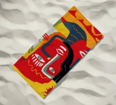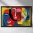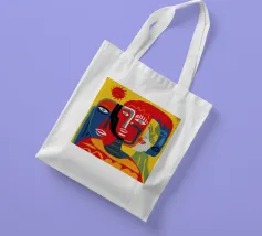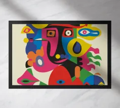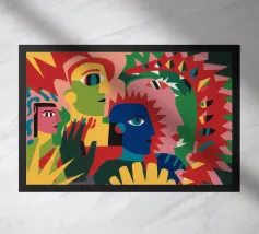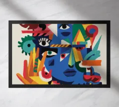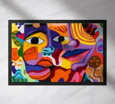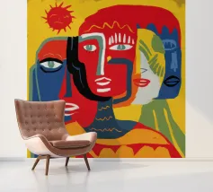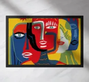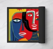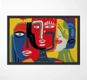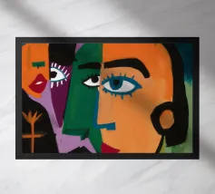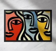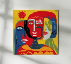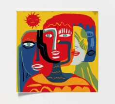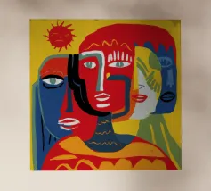 Un ritratto astratto potente e crudo di tre volti, reso con colori primari audaci di rosso e blu e contorni neri, che trasmettono un'energia primordiale e cubista.