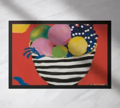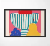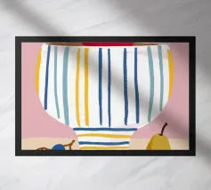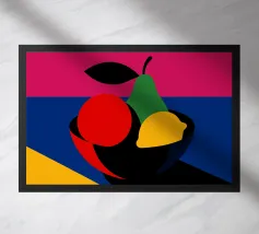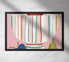 Una natura morta semplice e classica con una ciotola a righe con una mela, una pera e dell'uva, su uno sfondo rosa.